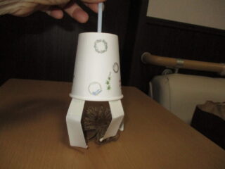 2025.09.30 あおえ岡山 秋本番!『栗キャッチャー』で🌰栗拾い♪ 紙コップ2個とストロー1本を使って作った『栗キャッチャー』 ストローを上に引っ張ると、下のグリップが閉じるようになっています ちょっと見にくいけれど、イガグリをキャッチした様子がこちら さあ!時間内に何個イガグリをキャッチできるかな❓